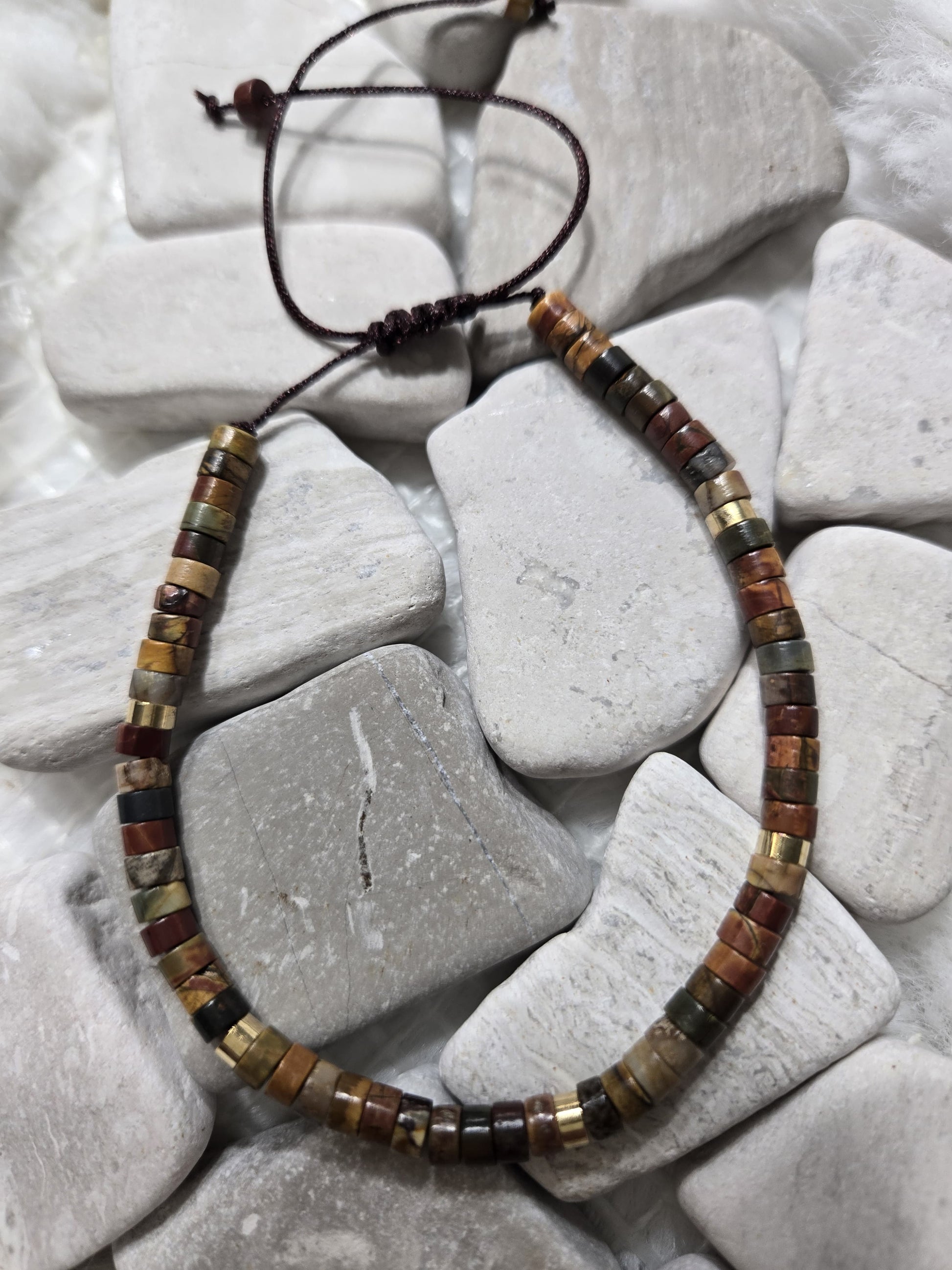 Adjustable bracelet with cylindrical beads in earthy and metallic tones, giving it a rustic yet elegant style. Lightweight, modern, and ideal for everyday wear.
