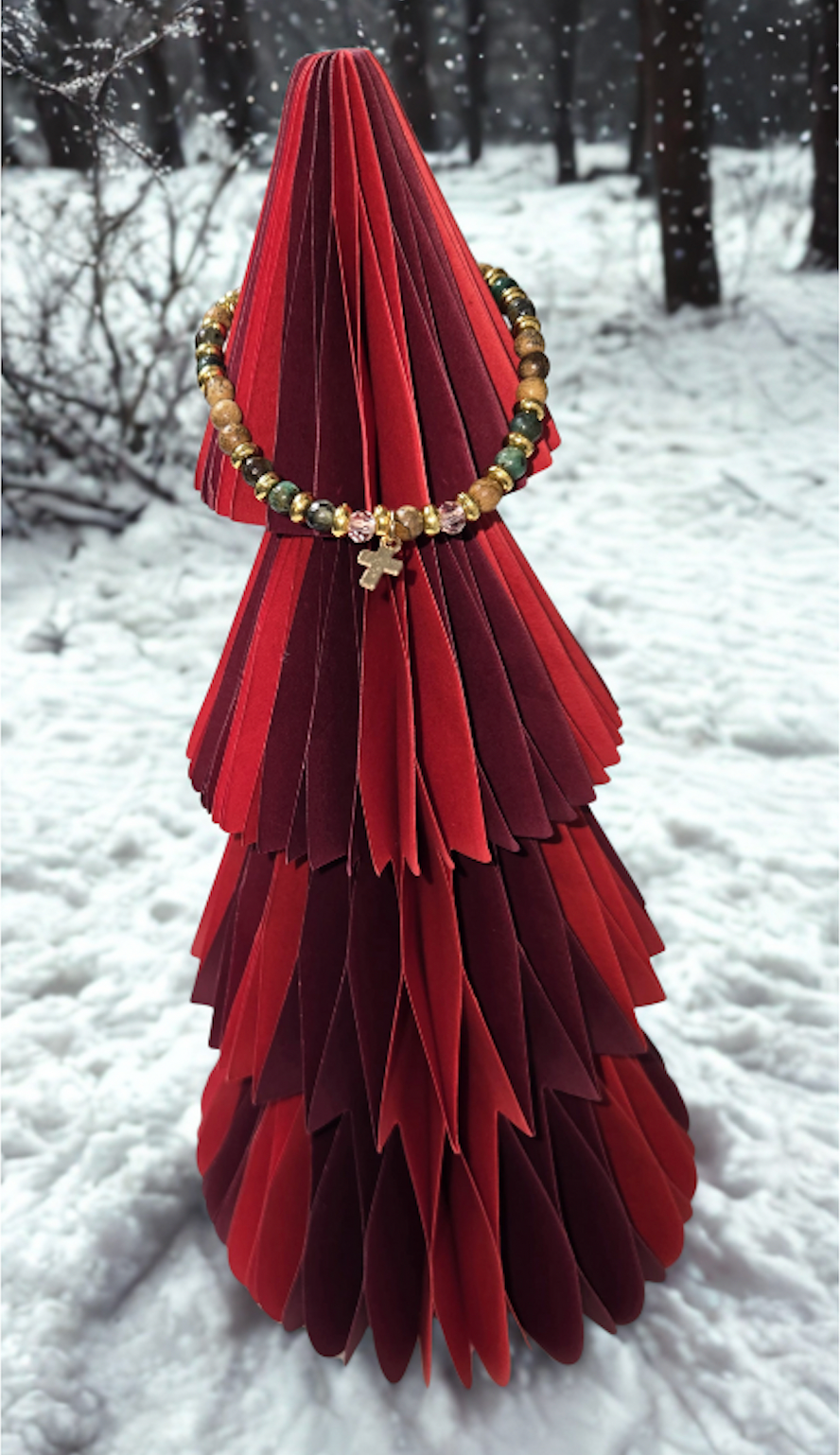 Adjustable bracelet crafted with natural beads in earthy and green tones, paired with delicate gold spacers for an elegant touch. At the center, a small gold cross charm adds a spiritual and refined detail. Lightweight, comfortable, and perfect for everyday wear or as a meaningful gift.